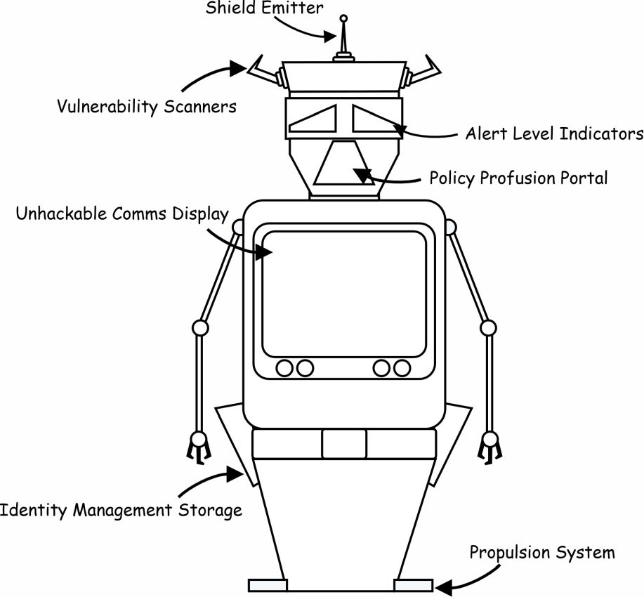 The story of Sigh-burr began when the company hired a new leader to head its Cyber Security team, thereby the name. Sigh-burr’s construct is essential in today’s environment of hackers and phishers. We start at the top with a Shield Emitter, which engages whenever a threat is detected. Detection is performed by the Vulnerability Scanners located on either side of his head. His eyes perform an additional function as Alert Level Indicators and will change color based on the threat level detected. His mouth, or Policy Profusion Portal, ensures that everyone is aware of the current security controls and standards. To communicate visually, his chest is equipped with an Unhackable Comms Display which maintains the barest drivers and controls. Identity Management Storage is holstered around his waist for easy access and protection. His mode of transportation is a Propulsion System consisting of 4 independent drive, pivoting, rotors connected to his base. |