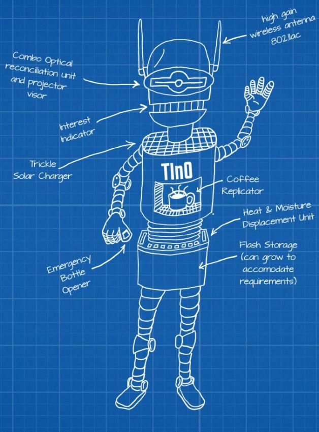 Many years ago (seconds in robot time), we had a new leader join our OCIO (Office of the CIO). Shortly thereafter, he made a request that a SharePoint site be created for himself and one for each of his direct reports. His main site would be called “Technology Infrastructure and Operations” or TI&O for short. Now, the only thing missing was the hapless soul to be tasked with this new “opportunity.” As fate would have it, I happened to be walking past his office on the way to get a 5th cup of coffee, and behold, a volunteer was born. On my way home that evening, enjoying all the pleasantries of Northern Virginia drivers, traffic, and stoplights, my thought process went from TI&O to TInO (pronounced tee-no) to thinking of the material “tin” to thinking of the Tinman from "The Wizard of Oz", to thinking “robot.” Now that my focus was on a robot, I had to think about what to use for inspiration in the creation of it. It became clear to me that the inspiration should be none other than the man who tasked him with such an auspicious responsibility. That weekend on my deck with a sketchpad (and maybe a beer) Tino was born. What design features of Tino were inspired by our leader you ask? Well, for one, Tino is a bit hair challenged. Also, let’s just say that the first few days for him in his new role were challenging, so the dent in Tino’s cranium represents the manifestation of the mental picture of him banging his head on his desk. Other design aspects represent different projects and concerns he had at the time, like Wi-Fi in the enterprise, storage in the datacenter, heat in the datacenter, etc. Tino’s design has evolved over the years, but the essentials have been kept. My sights then focused on the creation of robots to represent each of his direct reports. However, those are stories for another time... |